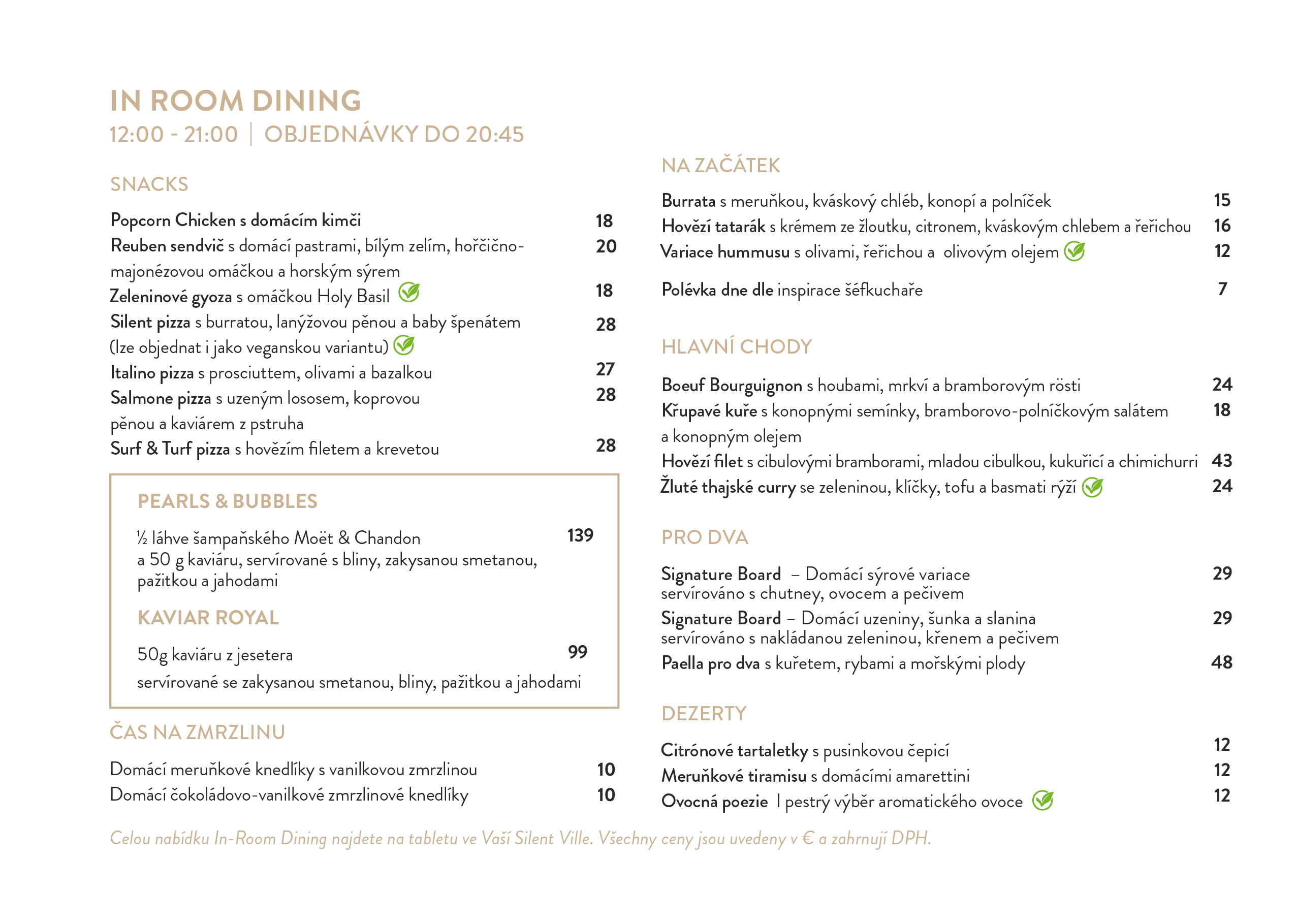 Jako hosté Silent Villas můžete snídat exkluzivně přímo ve své vile nebo si vychutnat snídani formou bufetu v hotelové restauraci. Od 12:00 do 21:00 Vám rádi připravíme čerstvé občerstvení, saláty a vynikající soul-food, které si můžete vychutnat v naprosté pohodě a soukromí přímo ve své vile nebo na terase.