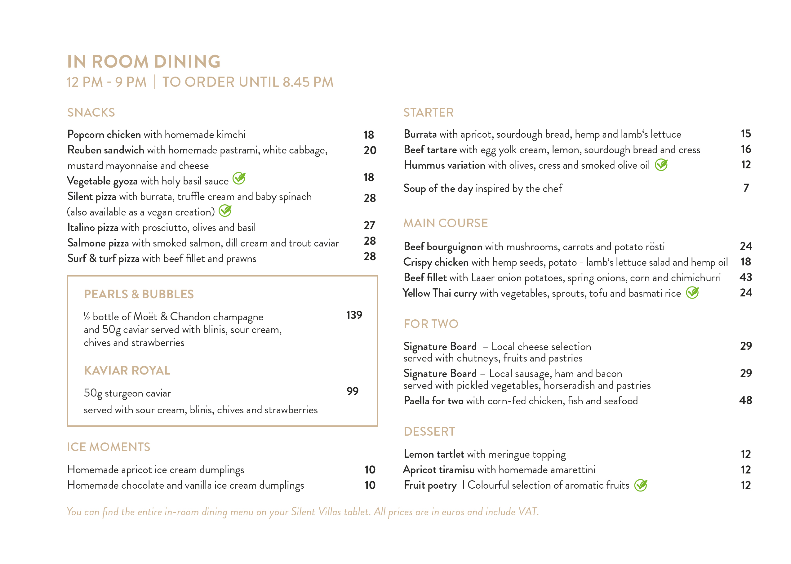 As a Silent Villas guest, we serve breakfast exclusively in your villa or you enjoy our breakfast buffet in the hotel restaurant. Thanks to In-Room Dining, we spoil you from 12:00 to 21:00 with snacks, salads and delicious soul food – enjoy dining directly in the villa.